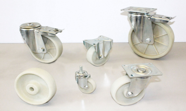 White nylon 6 wheel with glass fibers, switable for high temperatures from-20 ° to + 130 ° C. . Hight flowability, also with full load on smooth flooring. Suitable for the pharmaceutical, chemical, food industry and environments with high humidity. Resistant to the corrosion of fatty animal oils and most of chemical products.