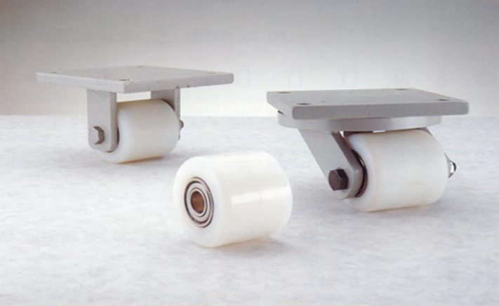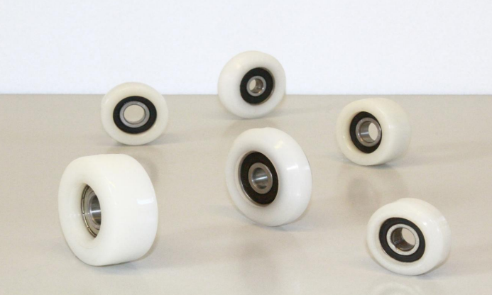 Rullo guida in nylon 6 bianco. Il Nylon e' iniettato direttamente sul cuscinetto a sfera . Resistente alla corrosione e alla maggior parte di agenti chimici.Resiste a una temperatura tra i -30° C e + 50°C .