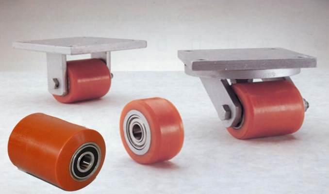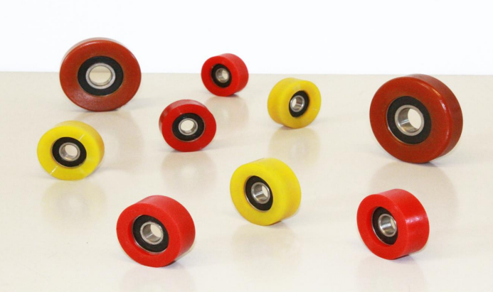 Guide roller with 92 Shore A polyurethane coating. The polyurethane is cast directly on the ball bearing. It is possible to supply them in various hardnesses.